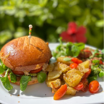 Hamburguesa con ensalada o patatas (pan casero, cebolla confitada, pollo estilo Tataki, canónigos y tomate)