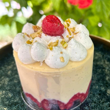 Jardín Crujiente (barra de cereales casera, crema de vainilla y frutas de temporada)