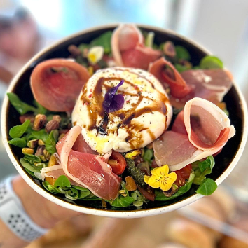 Focaccia sándwich (canónigos, tomate, jamón Serrano y crema de burrata)