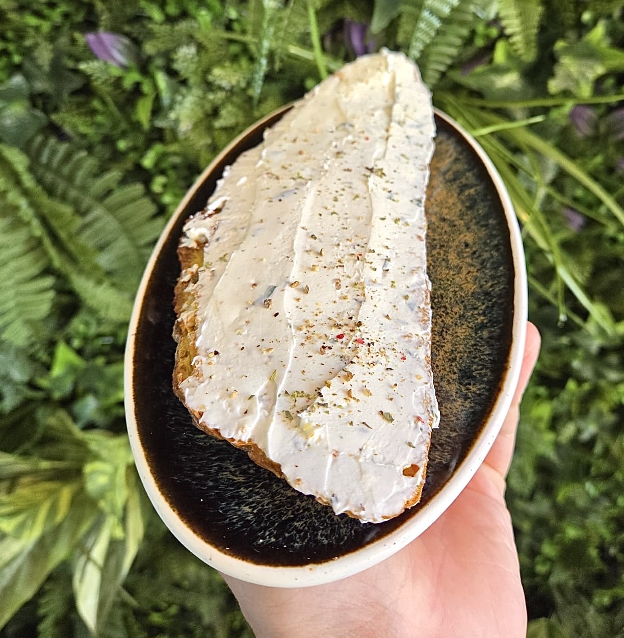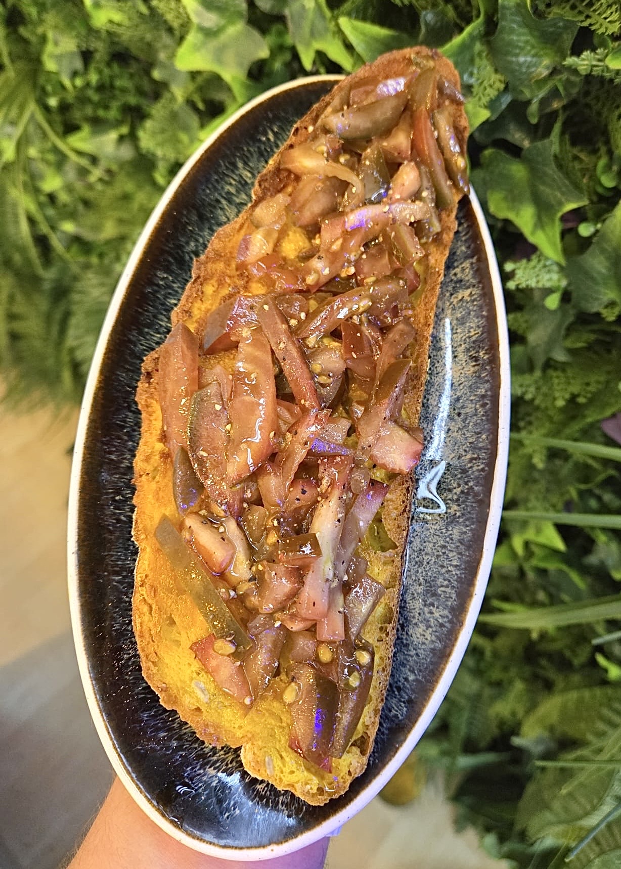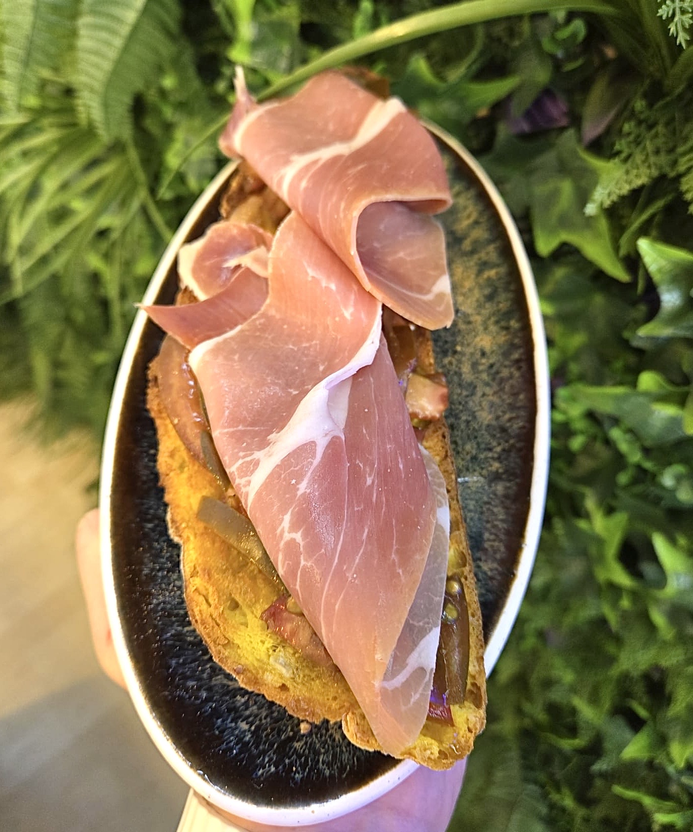 Focaccia de tomate, pesto, aceite de oliva y jamón Serrano
